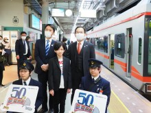湘南モノレール(鎌倉市常盤)大船駅で3月7日、「開業50周年記念ロゴマークコンテスト表彰式・開業50周年記念号出発式」が開かれた。