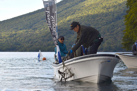 紅葉の名所として知られる栃木県日光市の中禅寺湖で、湖底に沈むごみの清掃が始まった。2日は3人のダイバーが水中に潜り、釣り糸が絡まった流木やプラスチックの容器などを回収。写真は引き上げられる流木。 【時事通信社】