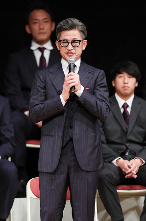 J3福島に加入した元日本代表FWの三浦知良が10日、福島市でチームの練習に合流。出陣式にも参加し、サポーターを前に「一つでも多くの勝利を皆さんと喜び合えるように、全力を尽くしていきたい」とあいさつした 【時事通信社】