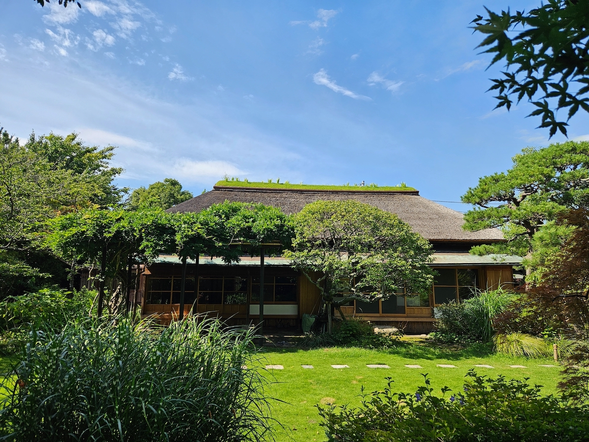 屋根の上に見えるアヤメ科のイチハツは花が咲く。大佛次郎の随筆「屋根の花」のなかで横須賀線の車窓から沿線の芝棟を愛でる場面があることから着想を得て修繕時に植えたという