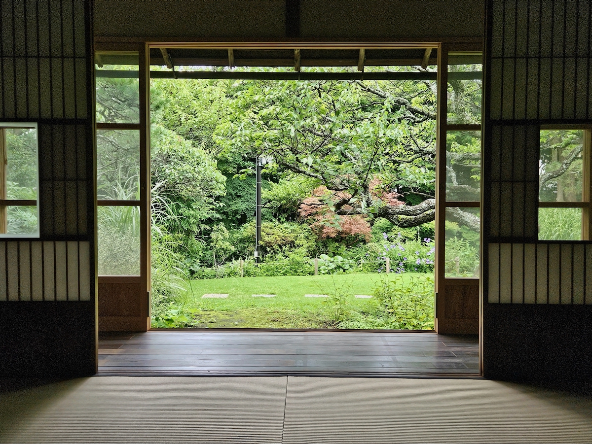 和室から藤棚越しに庭を見る。「建物には大佛次郎の嗜好(しこう)がそこかしこに隠れている。建築が好きな人もわくわくするはず」と佐藤さん