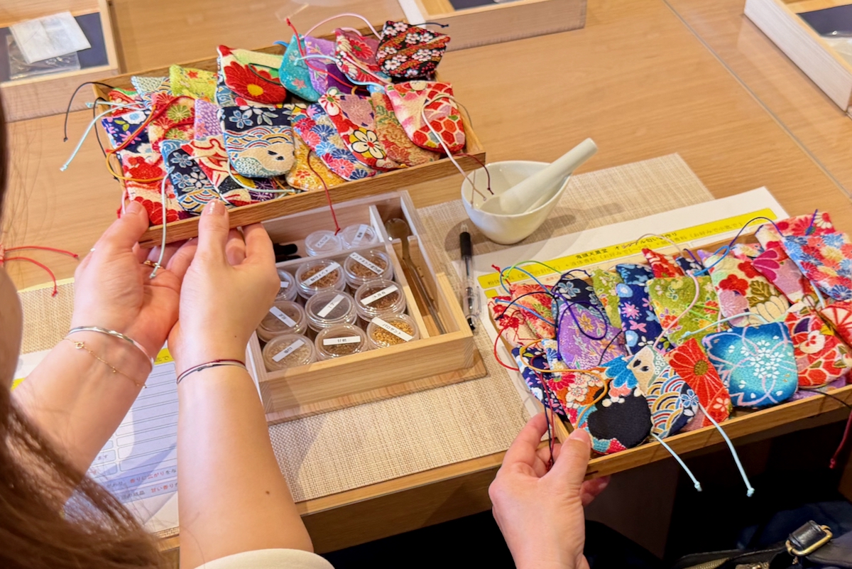 匂い袋作り体験会では、たくさんある中から選んだ袋に、自分で調合した香を入れた